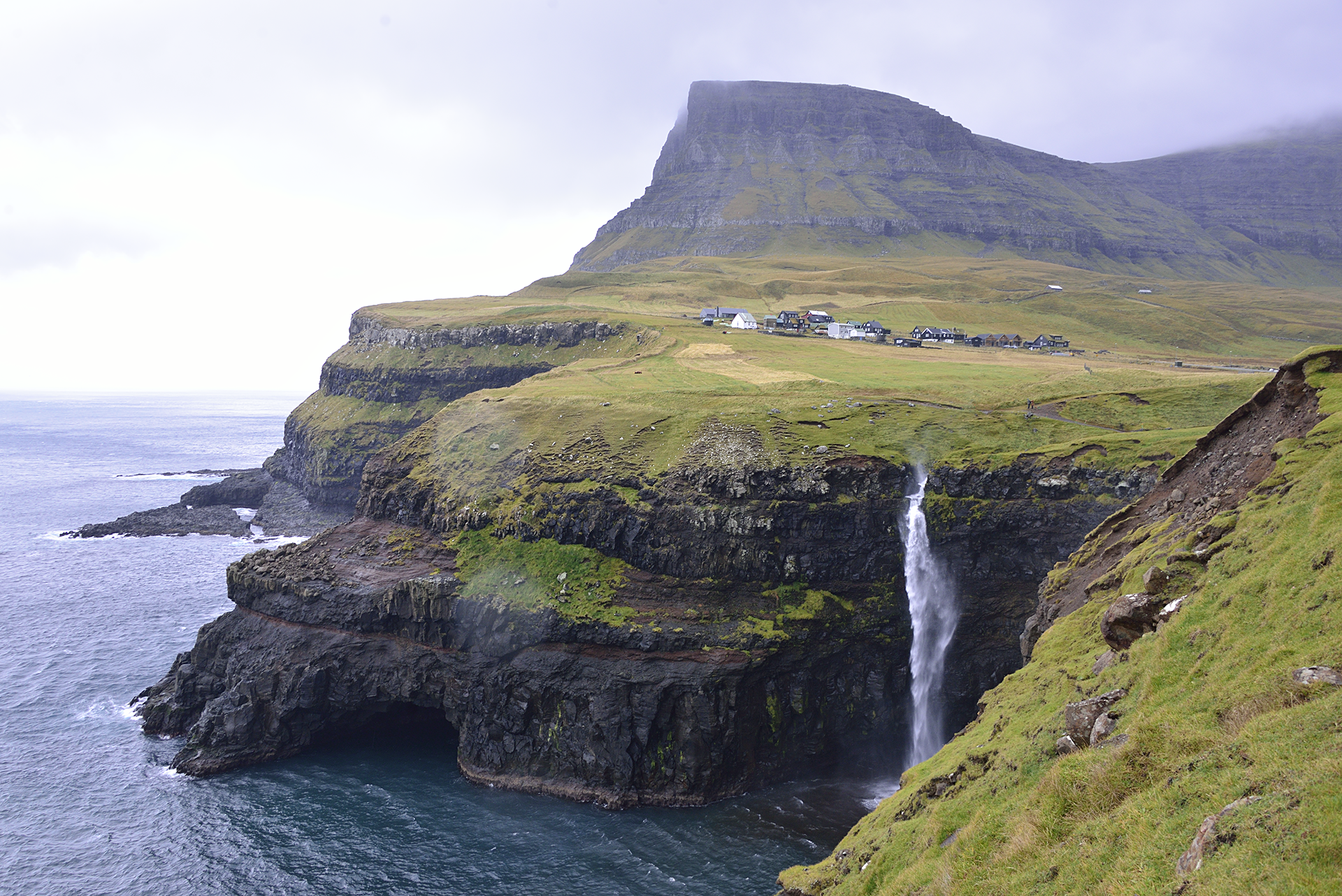 Durch den einzigen Tunnel dieser Insel geht es weiter in das abgeschiedene Dorf Gásadalur, das in früheren Zeiten einsam gelegen hatte. Genießen Sie einen Spaziergang zum meistfotografierten Wasserfall der Färöer Inseln, dem Múlafossur.