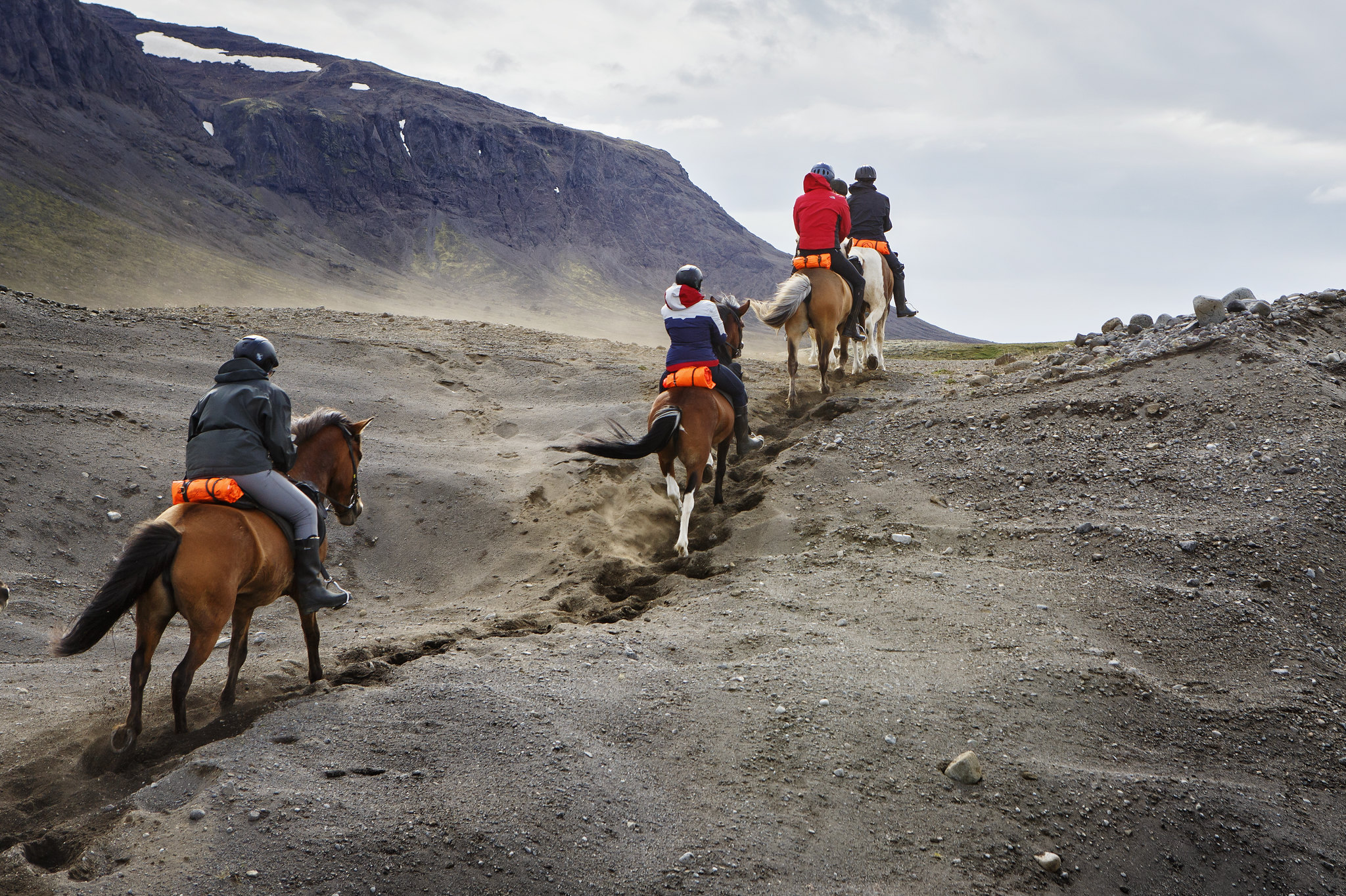 An diesem Tag findet ein besonderer Ausritt statt. Nur ein Pferd pro Reitendem wird mitgenommen, die restliche Herde bleibt an der Hütte. So lässt sich die Landschaft intensiver erleben. Der Weg führt nach Süden in Richtung des Gletschers Langjökull. Auf dem Berg Grettishæð bietet sich ein weiter Blick über das nördliche Hochland und die Hochlandwüste Stóri Sandur, eine karge Ebene aus Sand und Stein. In der Ferne ist der schwarze Vulkan Krákur mit seinem Lavafeld zu sehen. Grettishæð ist nach Grettir dem Starken benannt, einer bekannten Figur der isländischen Sagas. Der Legende nach wurde sein Kopf dort begraben. Der Rückweg zur Hütte Öndvegi führt entlang des Flusses Þjófakvísl. (ca. 20km)4. Tag: Berghütte Öndvegi – Strangakvísl – Lestarmannavað – Vatnsdalsárgil – Forsæludalur – Hvammur