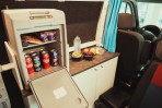 Das Campmobil ist mit einem unteren Doppelbett (175 x 140cm) und einem oberen Doppelbett (185 x 125cm) ausgestattet. Es gibt eine einfache Küchenzeile mit einer Spüle mit Kaltwasser und einer elektrischen Kühlbox.
