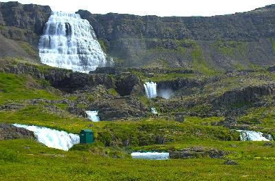 Dynjandi, der höchste Wasserfall im Gebiet der Westfjorde, liegt im Arnarfjörður. Er stürzt sich von der Hochebene Dynjandisheiði über zahllose Stufen rund 100m in die Tiefe und wird dabei immer breiter. Noch im 19. Jahrhundert war der Wasserfall als Fjallfoss bekannt. Sein heutiger Name – er bedeutet soviel wie "Dröhner" – leitet sich vom lauten Dröhnen des fallenden Wassers ab, daß über große Entfernung zu hören ist.