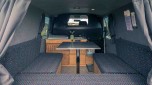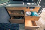 Spüle mit Kaltwasser, einer Kühlbox und einer Webasto-Standheizung. Die Sitzbank