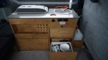 Die Küchenzeile ist ausgestattet mit einem Gaskocher, einer Spüle mit Kaltwasser und einer Kühlbox. Das Fahrzeug verfügt über eine Webasto- Standheizung. Die große Rundsitzgruppe bietet viel Platz am großen Tisch und kann schnell in ein großes Bett umgebaut werden, das obere Bett wird tagsüber im hinteren Teil des Hochdachs zusammen geschoben und kann abends schnell in die Schlafposition gezogen werden. Die Kopffreiheit des oberen Bettes ist begrenzt.